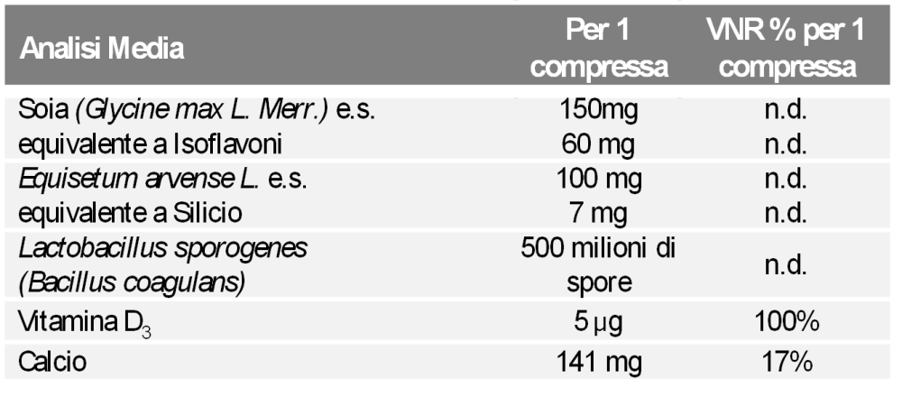 Ingredienti: Carbonato di Calcio; Stabilizzante: Cellulosa microcristallina; Soia (Glycine max L. Merr., semen) estratto secco titolato al 40% in Isoflavoni; Equiseto (Equisetum arvense L., herba) estratto secco titolato al 7% in Silicio; Antiagglomeranti: Carbossimetilcellulosa sodica reticolata, Sali di Magnesio degli acidi grassi, Biossido di silicio; Lactobacillus sporogenes (Bacillus coagulans LMG S-24828) (1,143%)*; Vitamina D3 (Colecalciferolo). Può contenere tracce di derivati del latte.