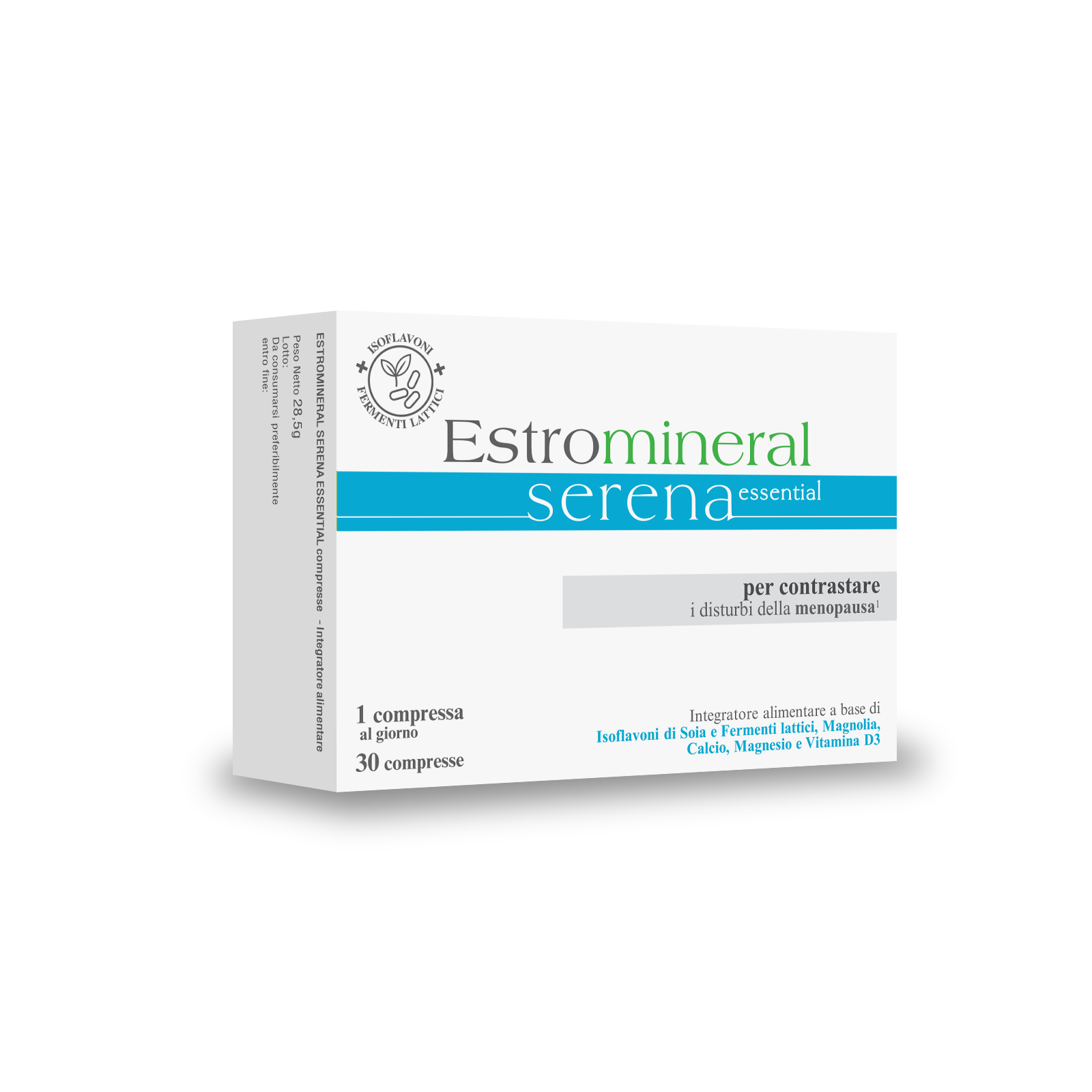 Integratore alimentare con Isoflavoni di Soia, Fermenti lattici, Magnolia, Calcio, Magnesio e Vitamina D3. (1) L’estratto secco di Soia (Glycine max L. Merr.), titolato in Isoflavoni, aiuta a contrastare i disturbi della menopausa. Il Magnesio contribuisce alla normale funzione psicologica e alla riduzione di stanchezza e affaticamento. Calcio e Vitamina D3 contribuiscono al mantenimento di ossa normali.