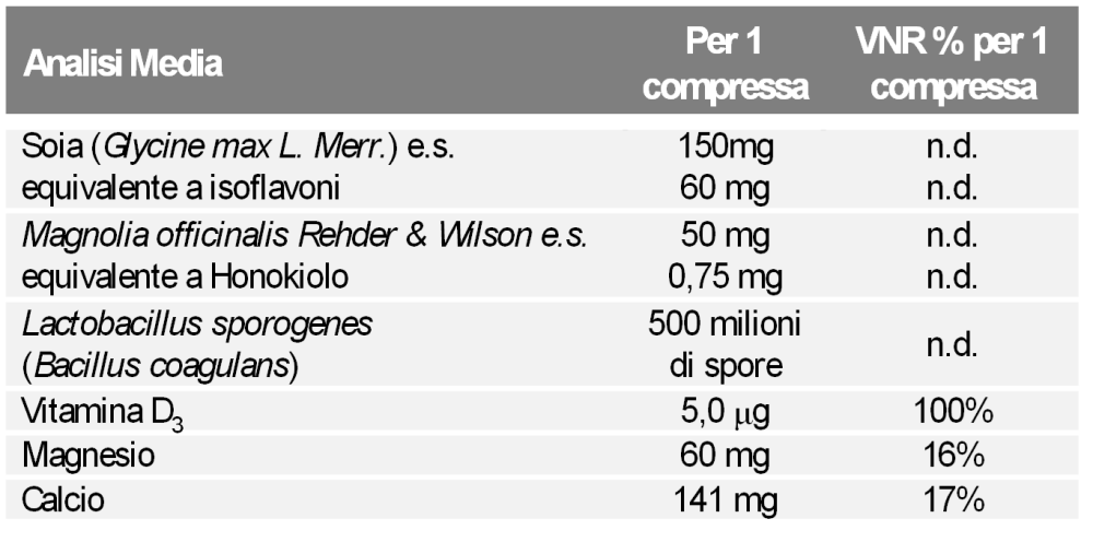 Ingredienti: Carbonato di Calcio; Stabilizzante: Cellulosa microcristallina; Soia (Glycine max L. Merr., semen) estratto secco titolato al 40% in Isoflavoni; Ossido di Magnesio; Magnolia (Magnolia officinalis Rehder & Wilson, cortex) estratto secco titolato all'1,5% in Honokiolo; Antiagglomeranti: Carbossimetilcellulosa sodica reticolata, Sali di Magnesio degli acidi grassi, Biossido di silicio; Lactobacillus sporogenes (Bacillus coagulans LMG S-24828) (1,053%)*; Vitamina D3 (Colecalciferolo). Può contenere tracce di derivati del latte.